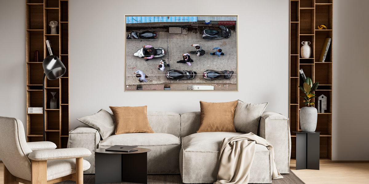 Les lignes. Celles des scooters garés en parallèle, celles des câbles tendus entre les immeubles, qui découpent la scène en strates. Tout semble obéir à un ordre inattendu. Même le béton fissuré participe à la composition. La rue reprend son souffle. À travers l’objectif, ce chaos devient géométrie, comme une partition où chaque passant, chaque objet, trouve sa place dans la mélodie.